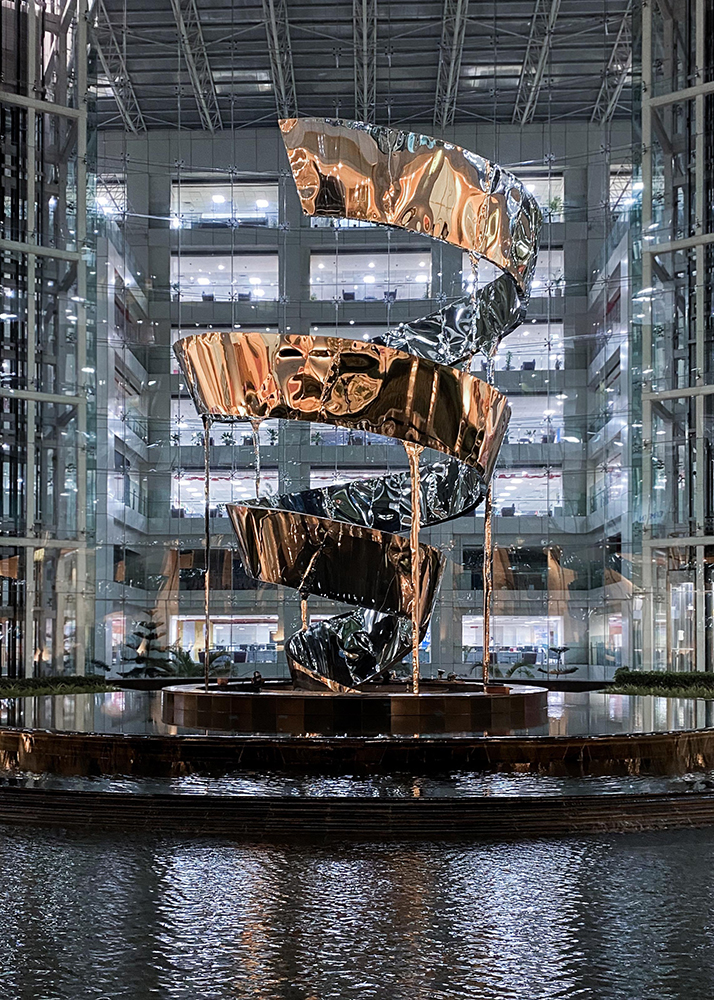 Inspired by Airtel's innovative spirit, A'rise is a 22-feet dynamic steel sculpture for company's headquarters in Gurugram, India. The sculpture embodies a narrative of dualities - the severity of steel is softened by its spring-like form, and the vigour of its structure is cushioned by the fluidity that surrounds it.
