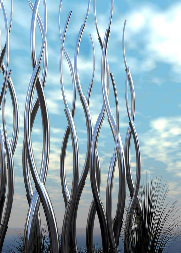 Blue Grass consists of a group of wavy stainless steel strands that undulate gracefully in a celebratory pattern. Each strand’s diameter gradually decreases from bottom to top, creating gaps filled with gentle blue glow.